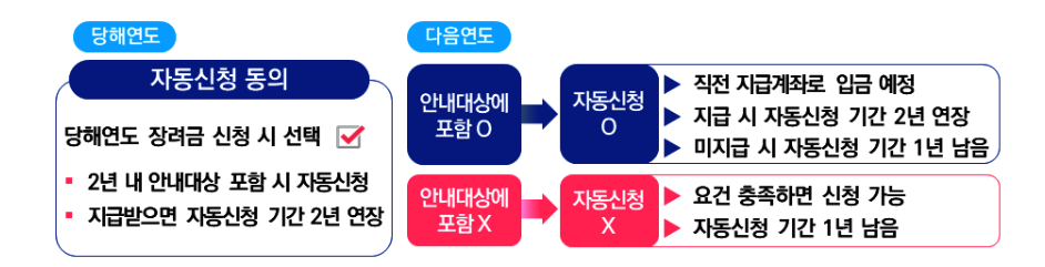 - 자동신청 제도: 신청안내 대상자가 장려금 신청기간에 자동신청에 사전 동의하면 향후 2년간 안내대상에 선정될 경우 장려금이 자동으로 신청
